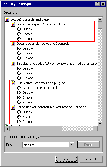You may encounter a bug in IE where the browser will sometimes show the Medium setting but will not actually use the proper settings for the Medium security level. In that case, click the Custom button and set each individual security setting as shown in the picture at right.