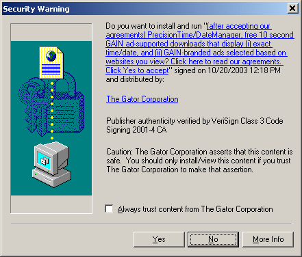 Drive-by download: Have you seen a dialog like this pop up while browsing? Answer YES and you will install a Gator application. Gator's marketing power lets them put ad-delivery software onto systems with high efficiency, using techniques such as drive-by downloads. Gator claims more than 35 million people currently have GAIN on their systems. If our survey results hold for the general population of Gator users, only a small minority of them consciously agreed to installing Gator's software and accepted its terms. Even if our information campaign can reach 20% of users with Gator, there are still going to be millions that are unaware. As the self-proclaimed "leader in online behavioral marketing," Gator should set an example by obtaining verifiably informed consent from users that install its applications. Based on what we have found, Gator's current procedures do not give users adequate notice when it is installed, and users aren't getting clear instructions for how to remove it when it is installed inadvertently. PC users, advertisers, and perhaps even the Federal Trade Commission need to draw a clear line on what constitutes adequate disclosure. What does Gator/GAIN do?As a general rule, Gator applications do a lot more than the original purpose that may have persuaded you to download them. Some of these things are spelled out in Gator's license, that very long document that most users inevitably don't read very carefully. GAIN displays advertising. A lot of pop-up advertising if you visit popular web sites or search for advertiser's hot words like "auto loan". Our experience was that its advertising was sometimes poorly targeted and therefore unlikely to be helpful. GAIN interrupts your work. Usually, your computer does things as a result of your own actions. GAIN actions don't follow that pattern. Their ads are often timed to pop up a few seconds after you've finished clicking on a link or entering data, which can be very distracting. If you want some more examples, see our review of Search Scout.